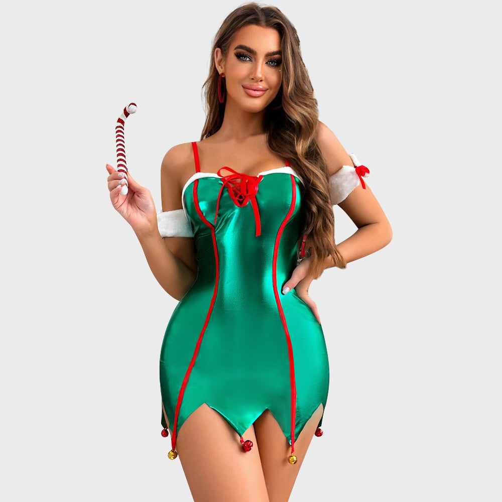 Design: The Sexy Elf Costume Dress featured metallic green dress with white fuzzy trim, adjustable spaghetti straps, a jagged edge hem with jingle bells, and a front lace-up design, this festive look is an ultra-comfortable way to add sparkle to your holiday.