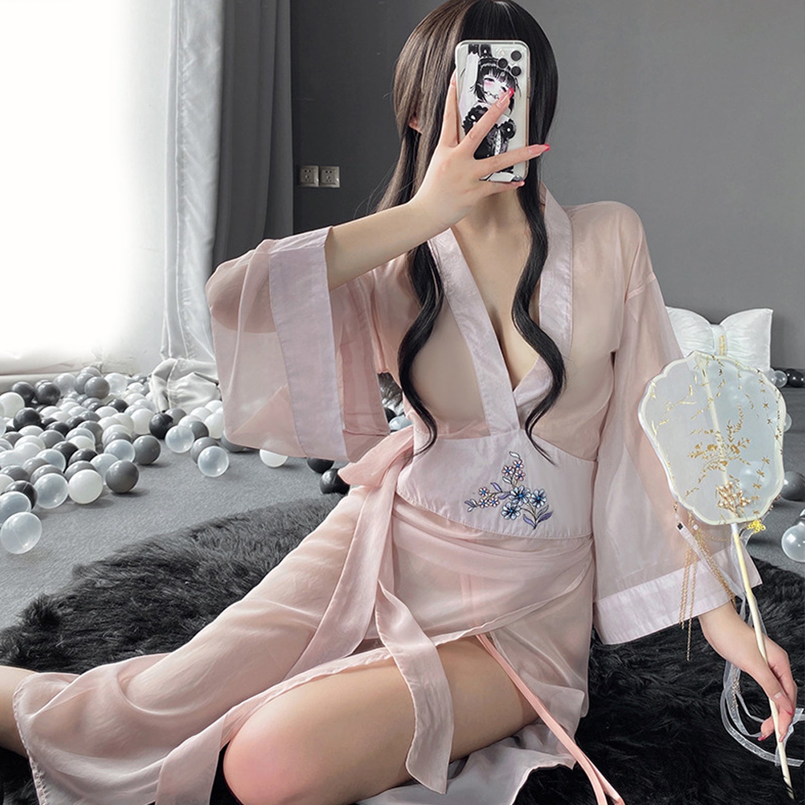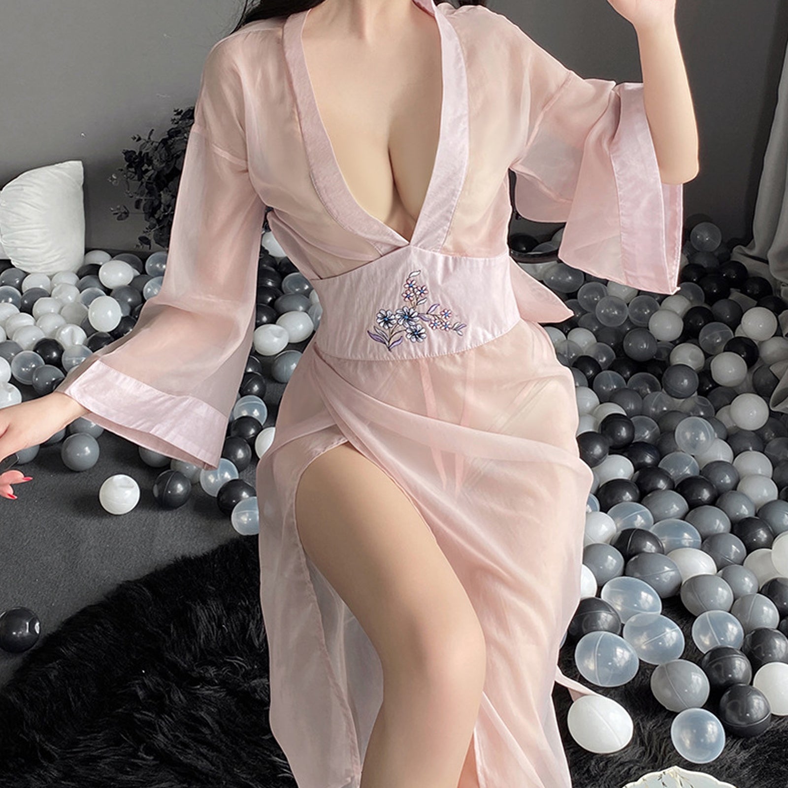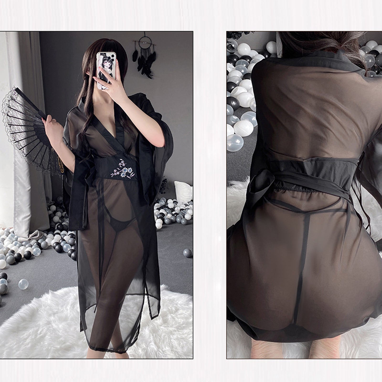 Japanese See Through Kimono Robe with long wide sleeves, floral embroidery at waist with satin belt on this women's kimono pajamas adds interest to your life and makes you look unique and sexier.