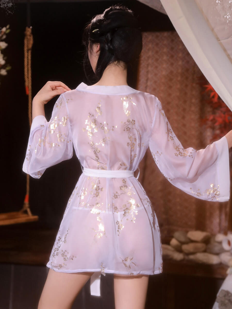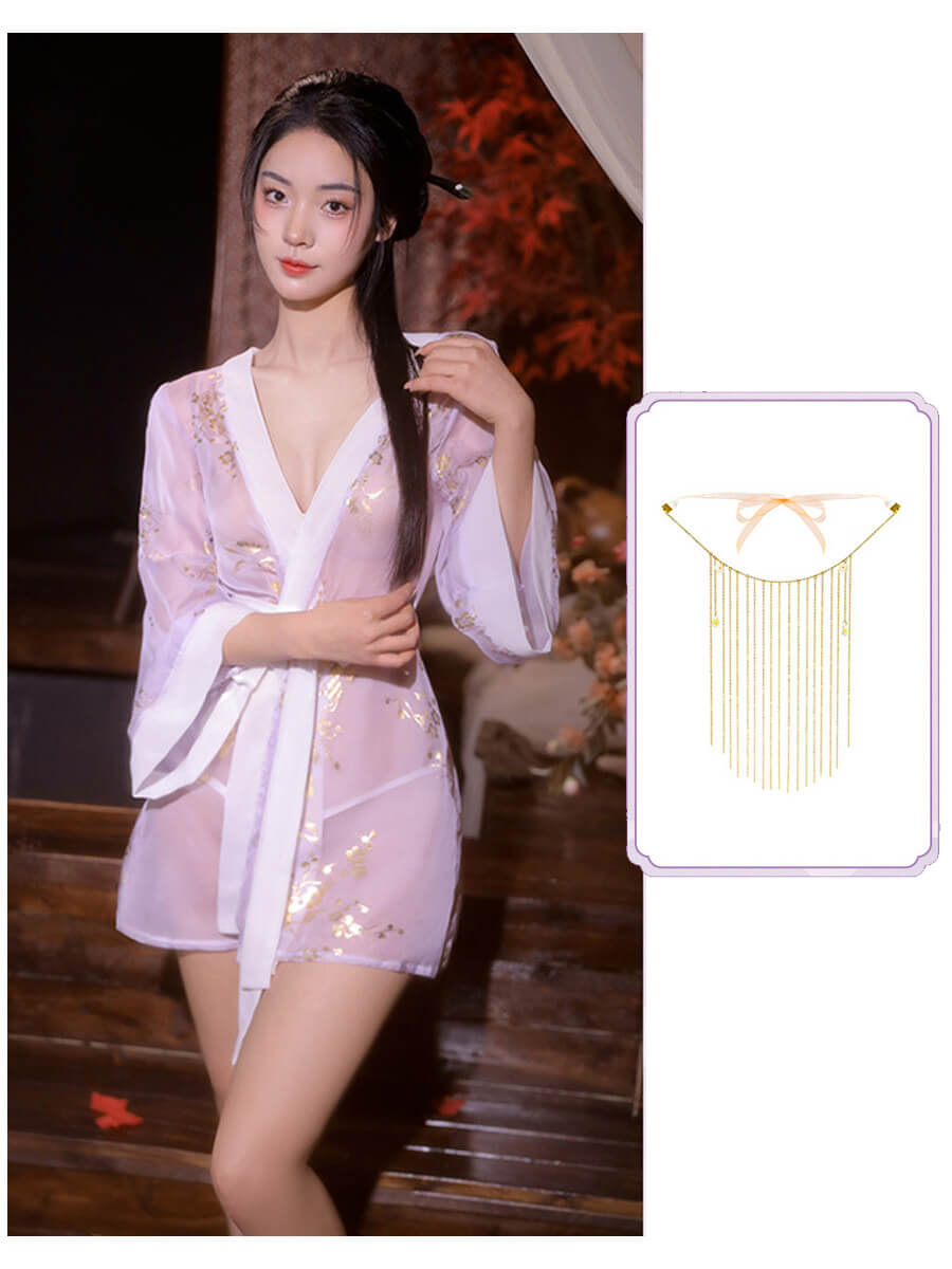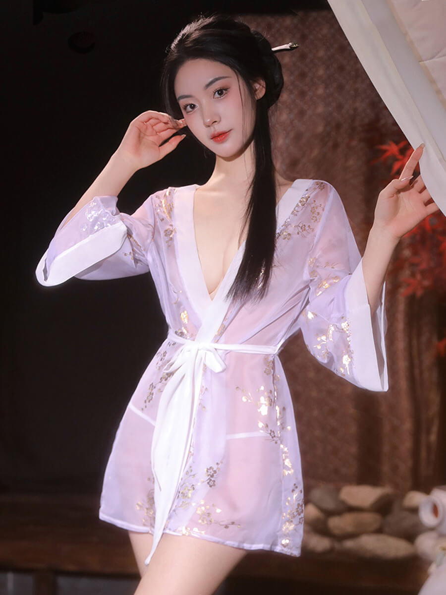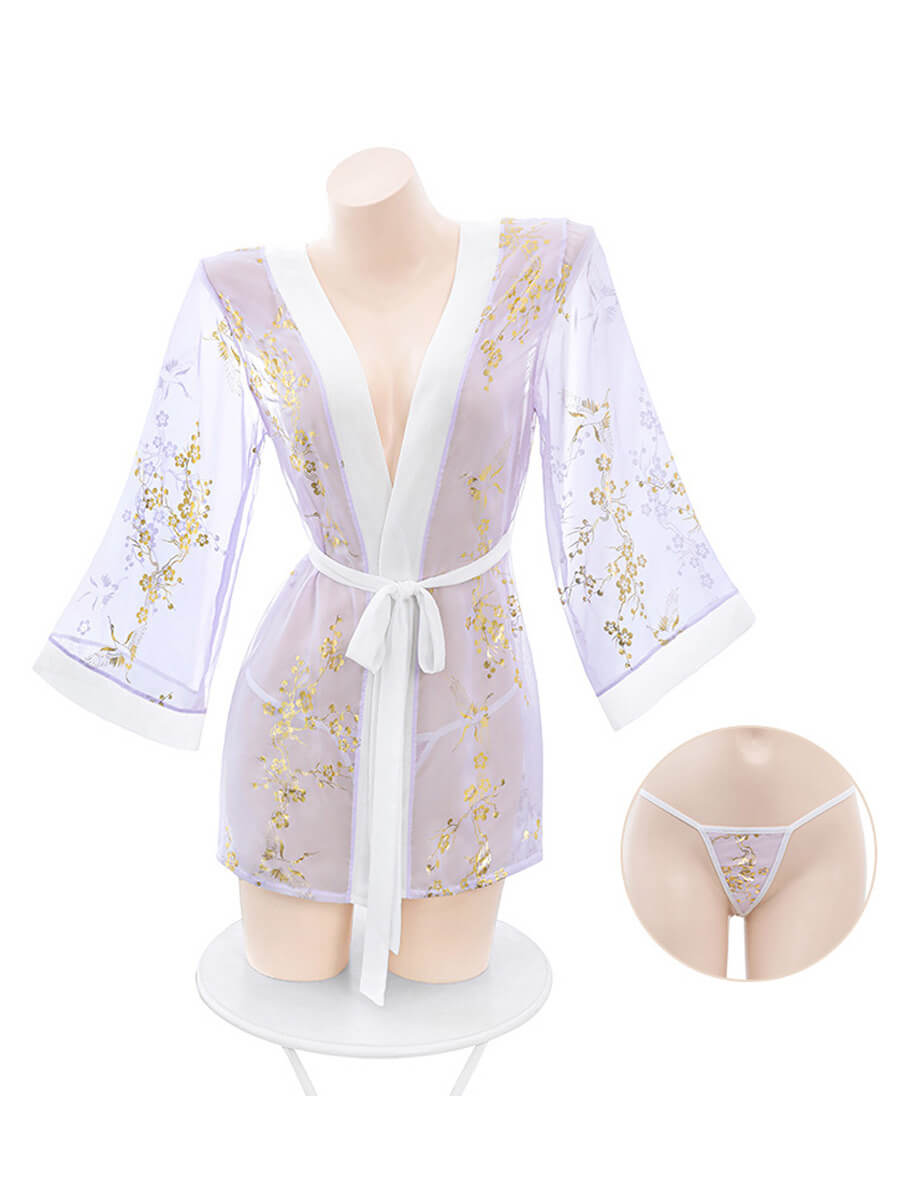 Japanese Sexy Cosplay Lingerie with long wide sleeves, gold floral print on this women's kimono pajamas adds interest to your life and makes you look unique and sexier.