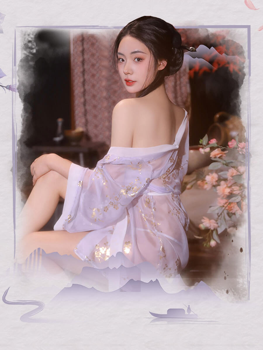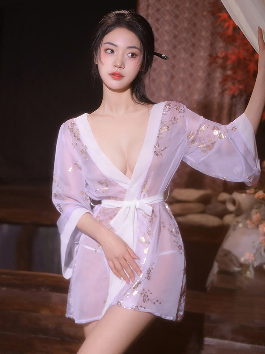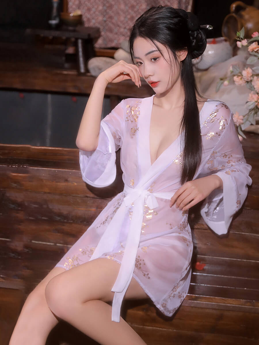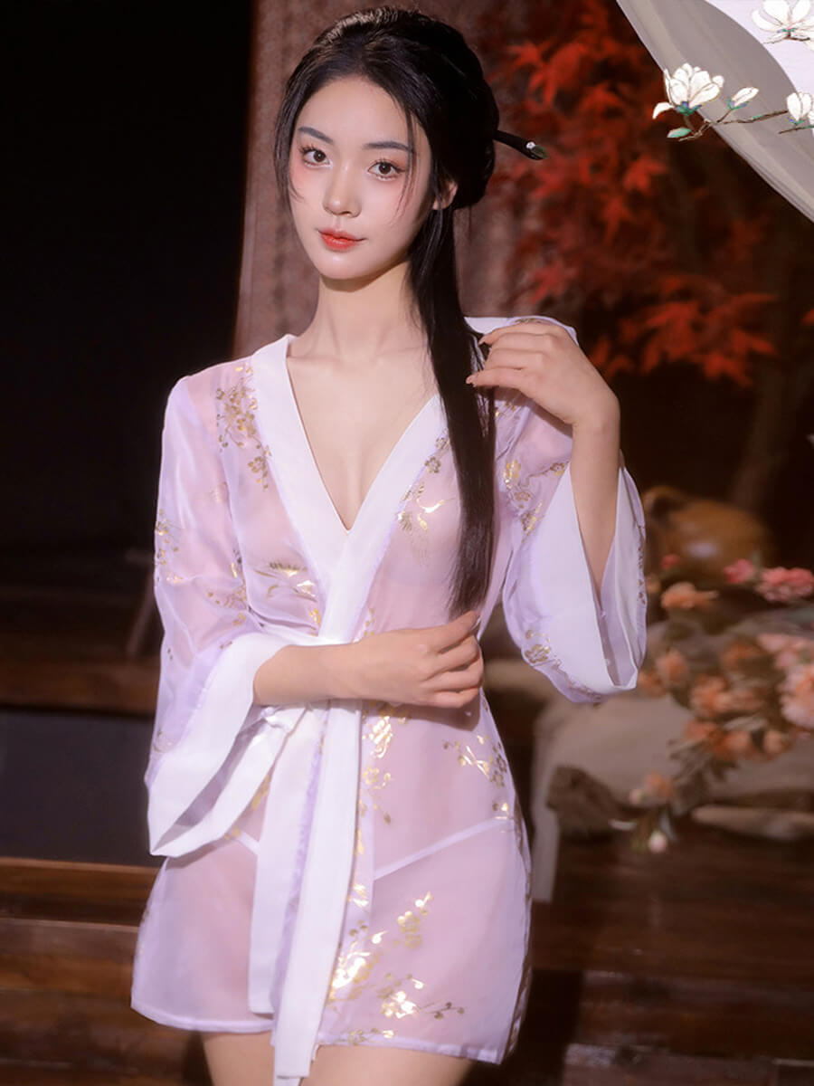 Japanese Sexy Cosplay Lingerie with long wide sleeves, gold floral print on this women's kimono pajamas adds interest to your life and makes you look unique and sexier.
