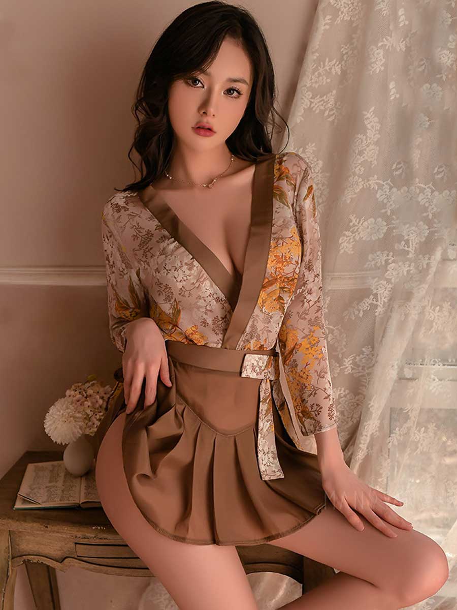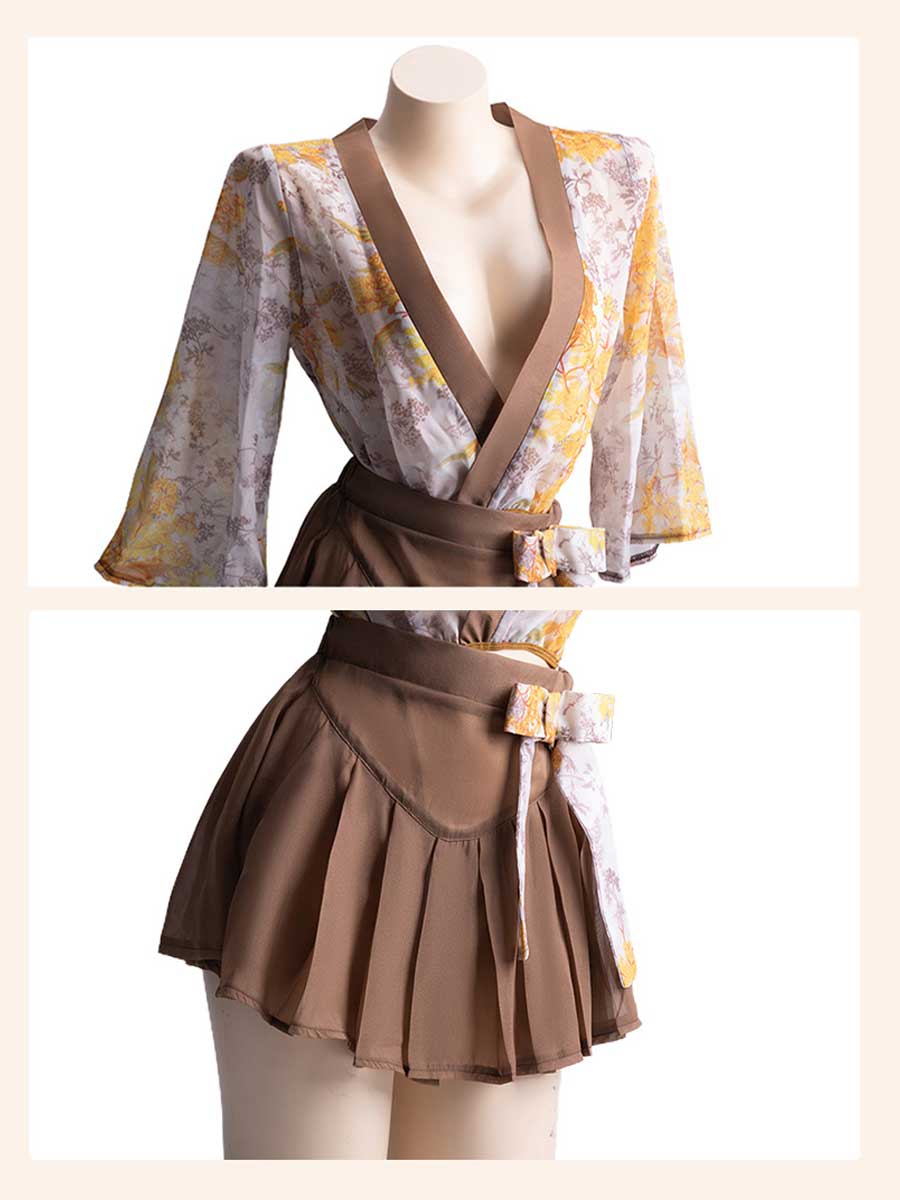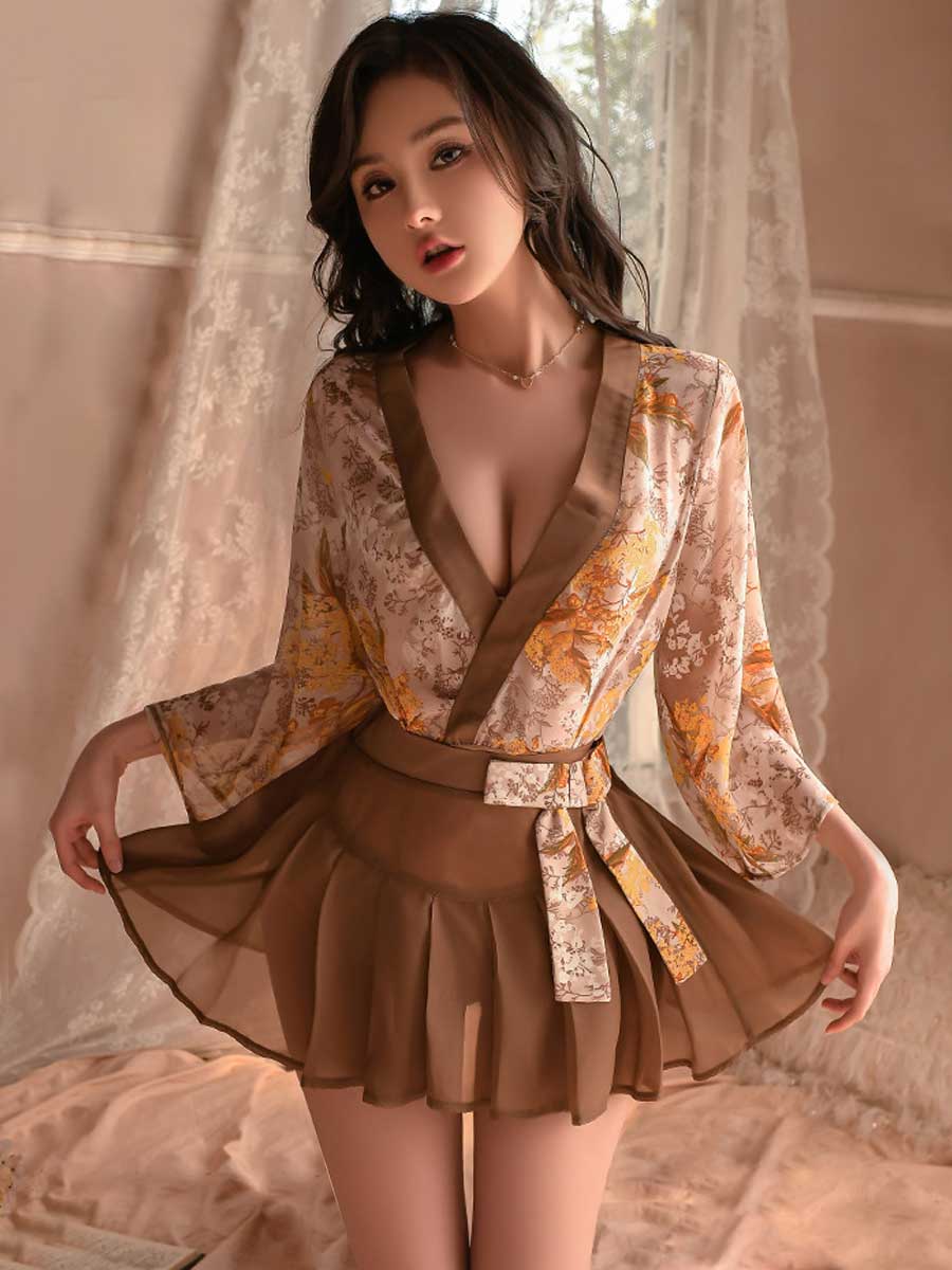 Design: Asrrss Sexy Kimono Lingerie Set featuring a sheer kimono style teddy bodysuit, semi-transparent but still offers some coverage, an allover floral printed, and an open crotch with booty framing straps. and a matching pleated mini skirt with bow accents, Elevate your lingerie game with the Asrrss Sexy Kimono Lingerie Set!