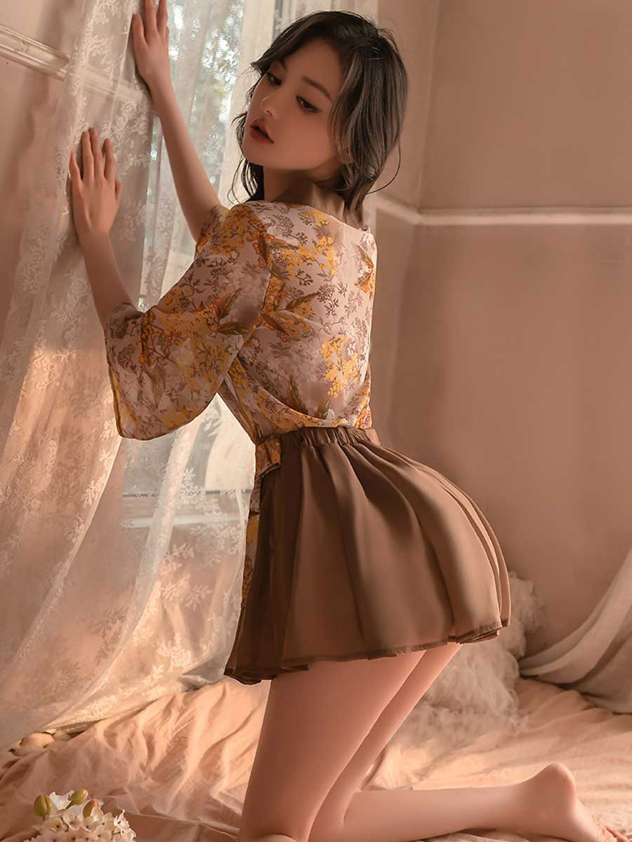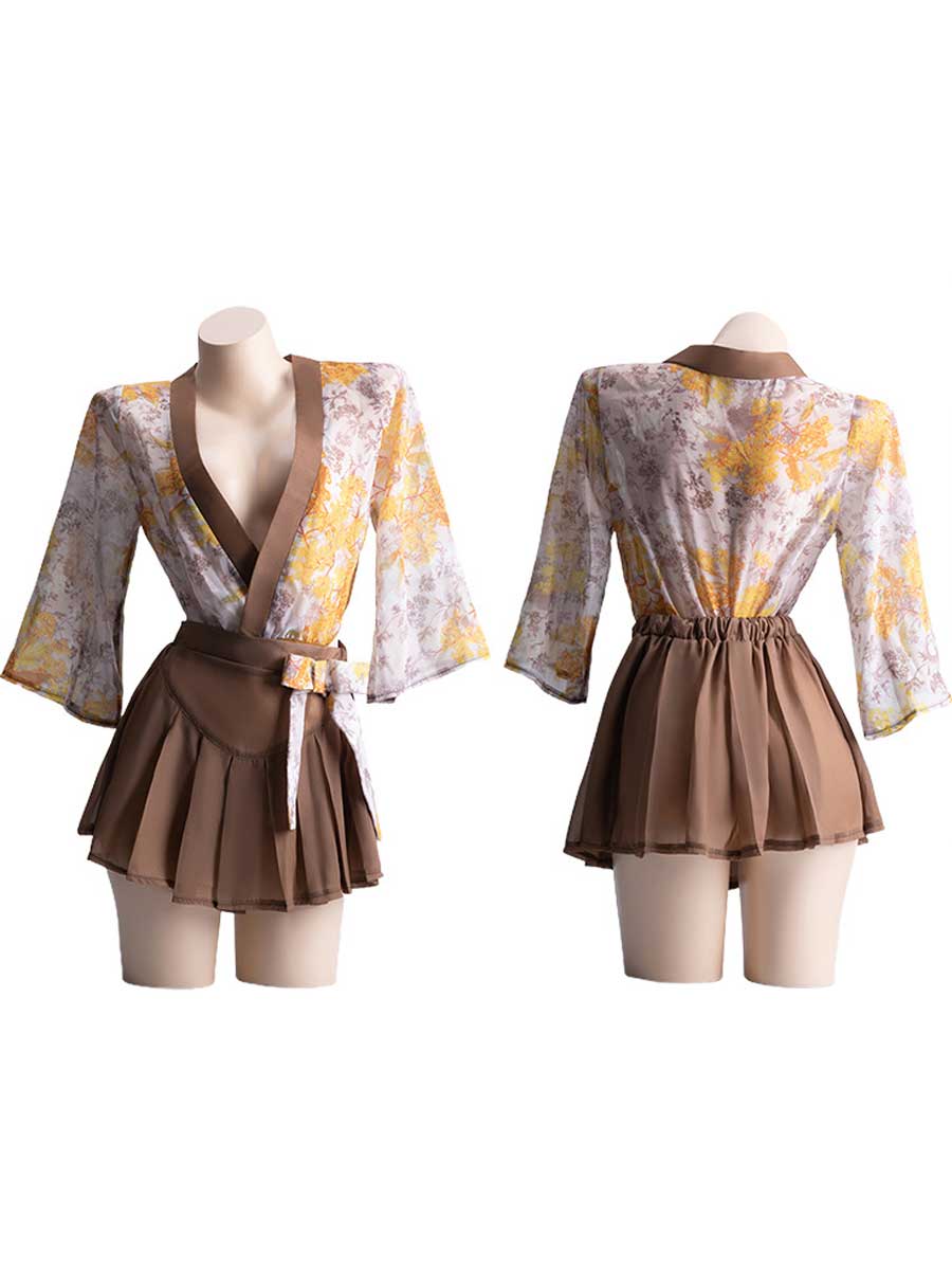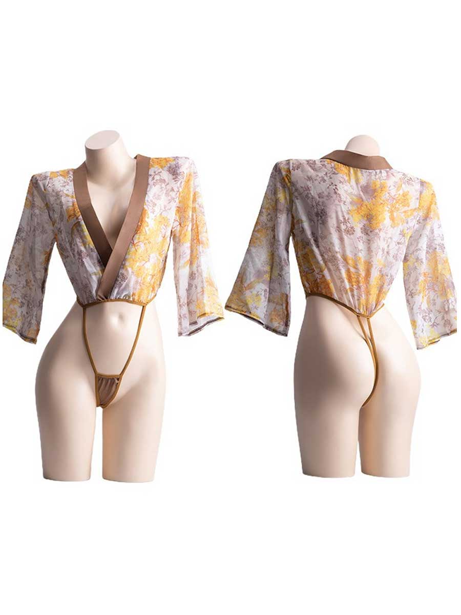 Design: Asrrss Sexy Kimono Lingerie Set featuring a sheer kimono style teddy bodysuit, semi-transparent but still offers some coverage, an allover floral printed, and an open crotch with booty framing straps. and a matching pleated mini skirt with bow accents, Elevate your lingerie game with the Asrrss Sexy Kimono Lingerie Set!