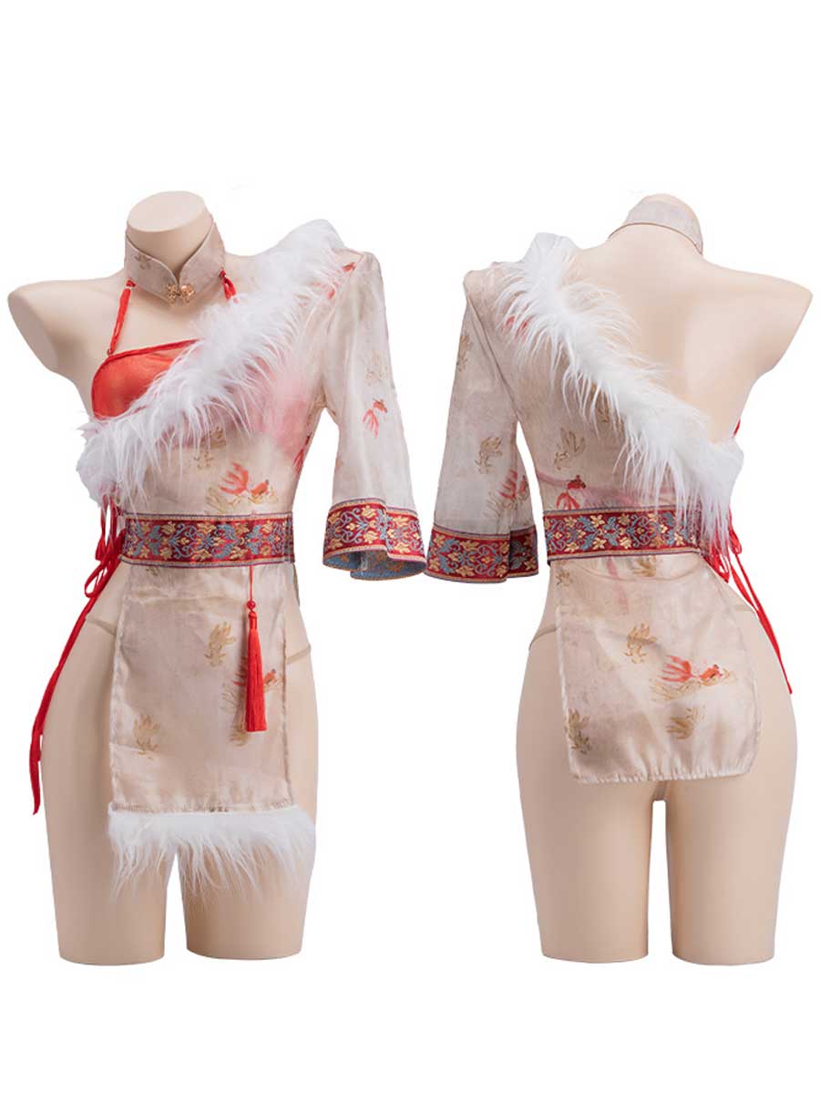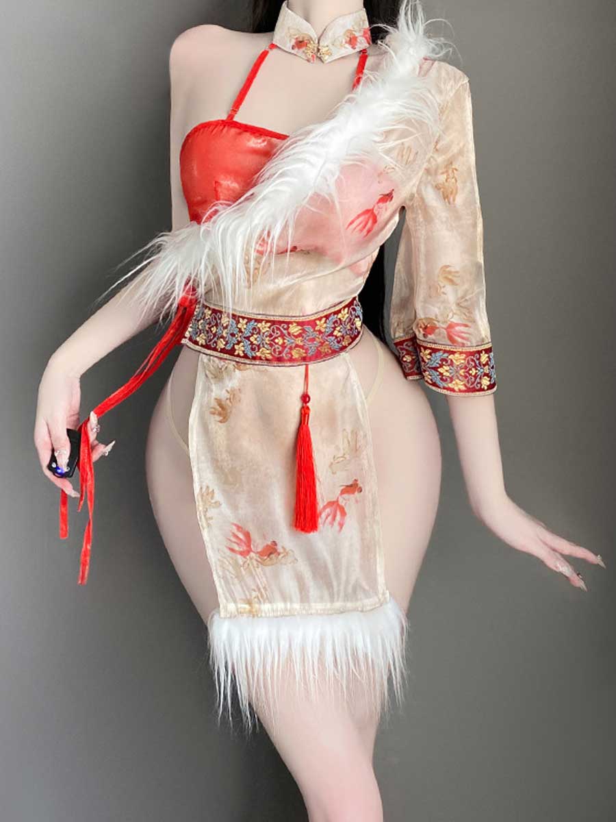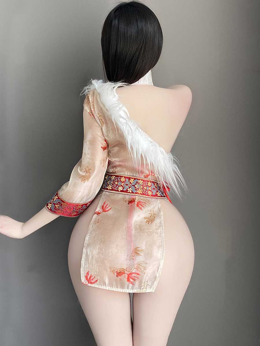 Design: Asrrss anime kimono robes featuring a sheer mesh kimono robe, one shoulder with one long sleeve, a white faux fur trim, a draping front and back panel, and a matching halter tube top, Show off your curves and figure while staying comfortable.