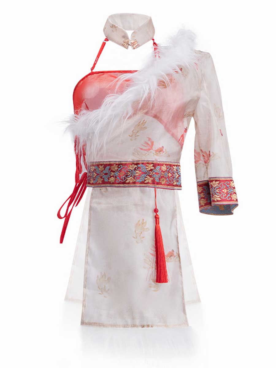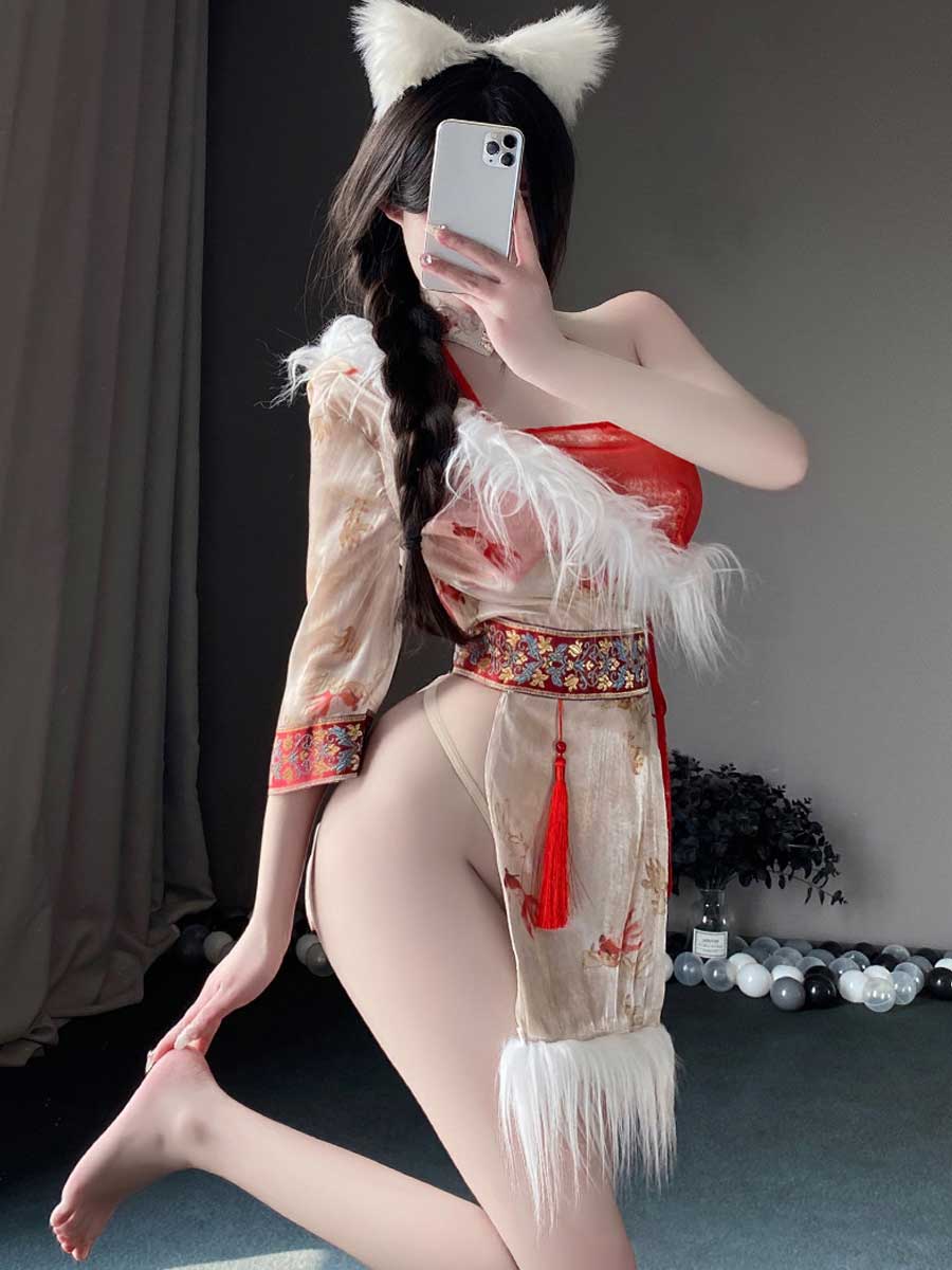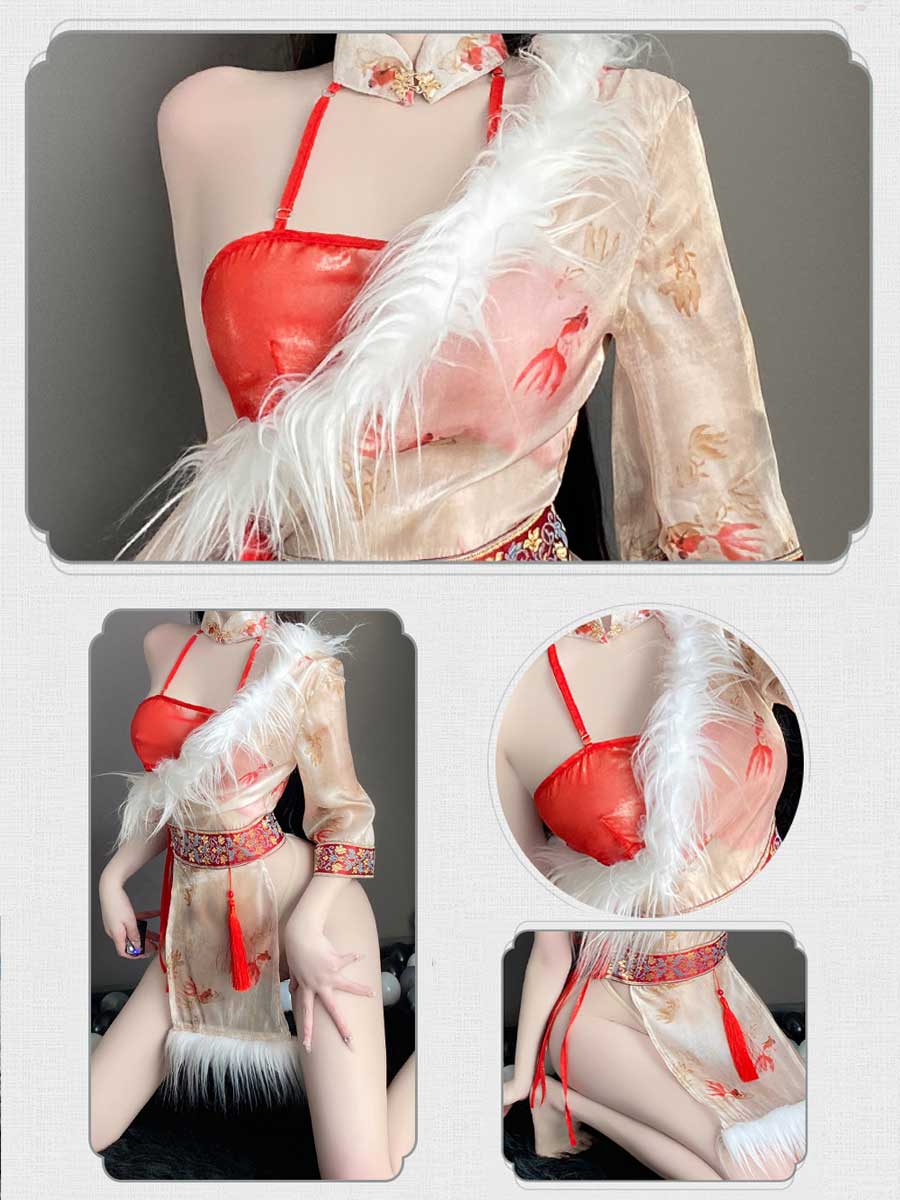 Design: Asrrss anime kimono robes featuring a sheer mesh kimono robe, one shoulder with one long sleeve, a white faux fur trim, a draping front and back panel, and a matching halter tube top, Show off your curves and figure while staying comfortable.